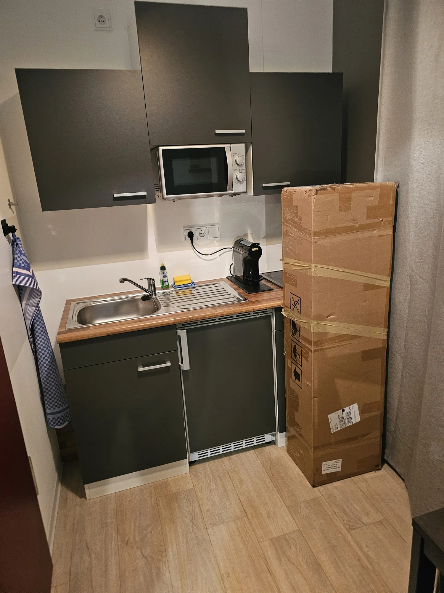 Mit einer Sackkarre bewaffnet und einer Verkleidung, wie ein Paketbote, habe ich mich auf eine Dienstreise begeben. Zum Glück ist ja heute alles Online und der Zimmercode kam per SMS, womit ich alleine die Kiste in den Fahrstuhl und aufs Zimmer bringen konnte.